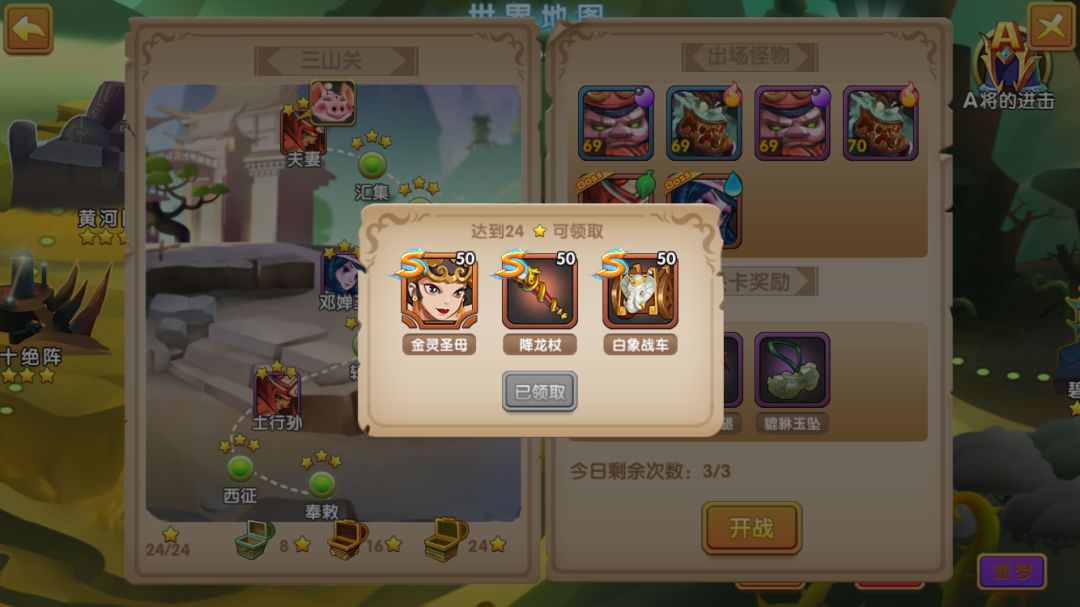 A将的进击---第1关:小怪强度为噩梦第1关的1.5倍左右,需要A将阵容到达橙色甚至金色才能流畅通关。由于大部分的A将都不太实用(功能不全面),加上获取门槛不低(钻石),把A将阵容整体提升到橙色或金色性价比不高,建议资源不多的同学不需要着急打A本。