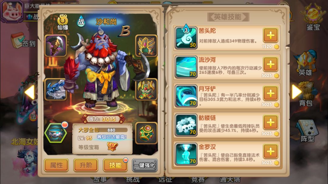 沙僧:相较于唐僧华丽的输出能力和八戒优秀的控场前排能力,沙僧只能作为一个秒金76%物抗的纯坦克,所有技能和法宝的效果都比较鸡肋,适用面不广。