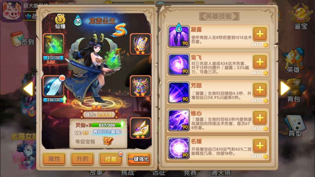 对于刚入坑未投入太多的新同学来说,签到七天送的紫龙吉是练级的主力,龙吉开大后基本清场(普通模式),龙王在橙后的群伤也很足。如果想对个别英雄快速练级,可以减少上场人数。由于关卡奖励的经验总数是固定的,那么人均经验就会更高。