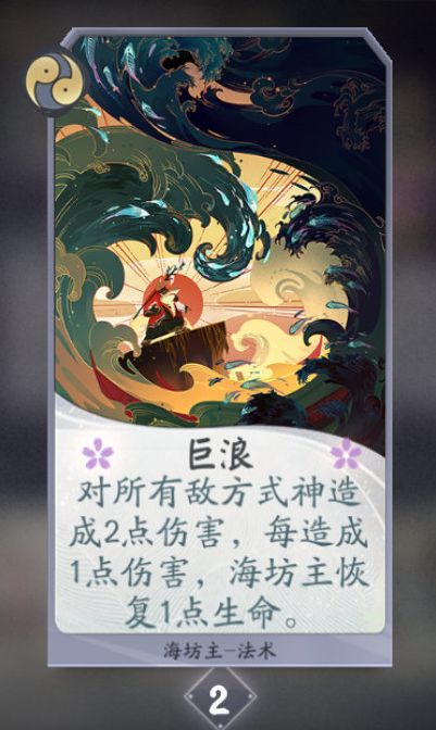 巨浪:巨浪是对抗快攻的神卡之一,先不说快攻队伍式神的血普遍薄,到了二勾形态打出一个巨浪往往能收割一片,其给予海坊主的巨额护甲值也是一道快攻队伍难以逾越的大墙,巨浪+海坊主平A能给对面站场式神造成4点伤害。