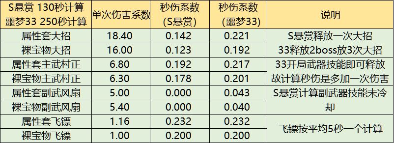 主武器打33因为遇到boss时可以立即释放,所以多加一次伤害,副武器打S悬赏按未冷却计算,打33按可释放两次计算