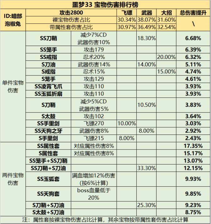上表是按单件宝物和套装两个分开排名的,一些明显不是伤害型宝物就没有排里,比如装黑龙套是为了三段跳,而不是为了伤害。
