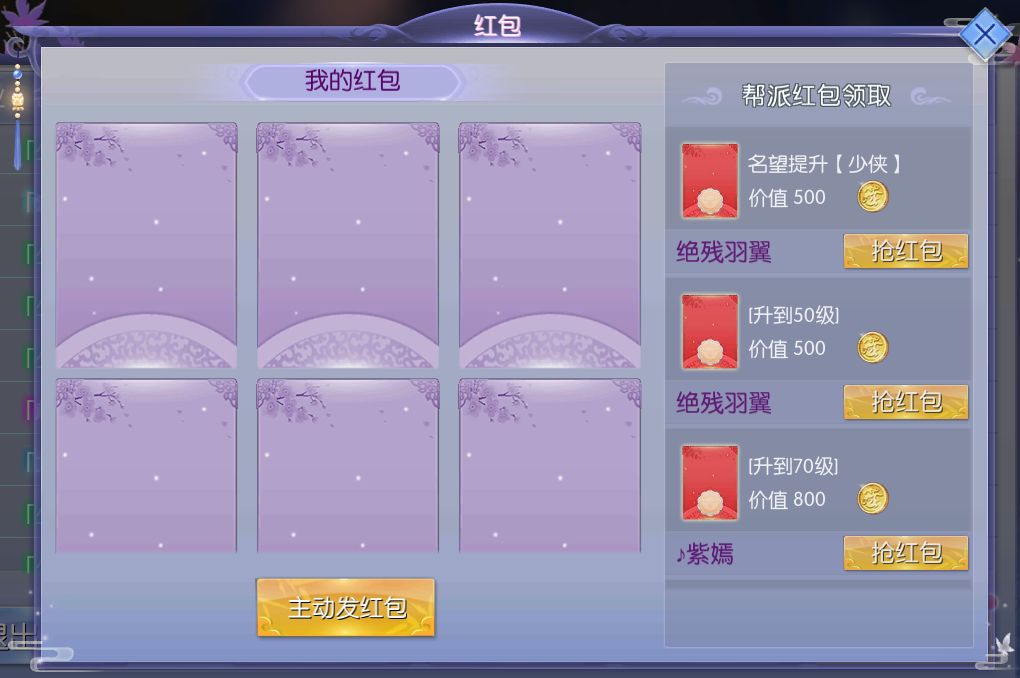 等级达到31级的少侠加入帮派即可领取七重帮派大礼,高达3000+的金币免费等你拿。加入帮派后,日常抢红包是获得金币的绝佳手段,帮内任一成员等级提升,名望晋升,装备提升,VIP充值等都可以给全帮成员发送红包,这个时候考验的就是少侠的手速了,领取帮会红包达到200次还可以获得“抢包达人”的称号。此外成为帮派的管理层每周都可以获得帮派俸禄,金额受全帮成员当周的活跃度影响。