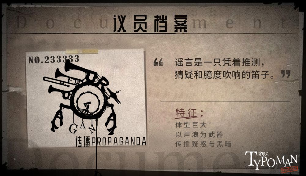 谎言LIE是传播PROPAGANDA大人最亲密的伙伴,他为传播提供了源源不断的动力。伴随着谎言的声浪击退了一波又一波的敌人,让他们能在字母世界横行无阻。