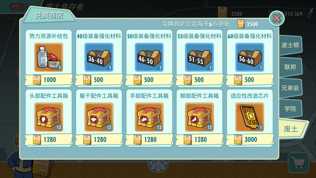 商店中新属性赋值芯片一次3000,资源包一次1000,部位升级箱一次1280,装备升级材料一次500。