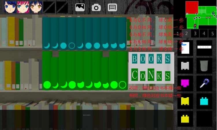 51.后退,右转,靠近前方的书柜,发现一排绿色书,也有一些图案(随机)。开始解谜。根据【书本】里的提示,查看照片,凡是对应相同的插进去(矮一些),不同的抽出来(高一些),柜子发生移动。