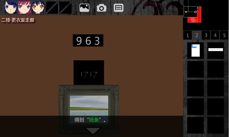 35.点击画,要输入3位数密码。目前只有963这一串3位密码,所以输入963,果然成功,获得【纸条】,同时又有密码1717(固定)。
