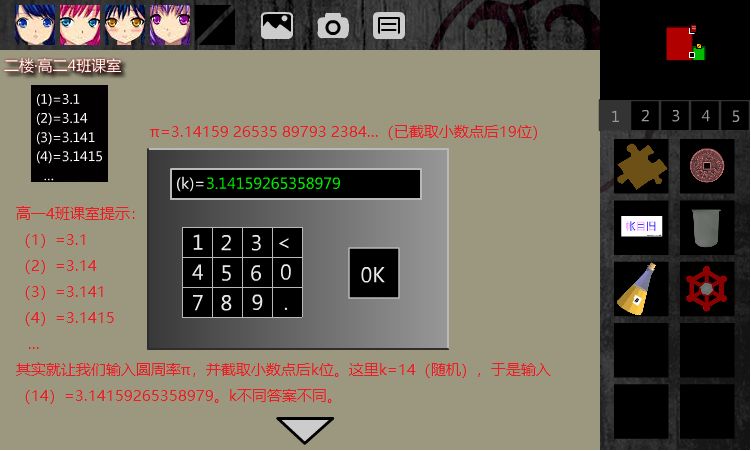 点击前方的密码器,有(k)=……。注意到1F•高一(4)班课室和珍弓(去高一4班课室点击线索可以查看详情)的提示,它其实就是输入圆周率π,并截取小数点后k位。