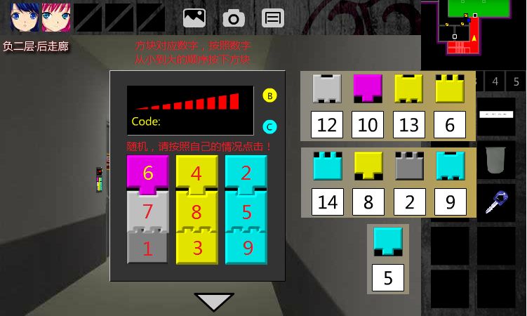 62.回到-2F•后走廊,发现音量密码器。把9个【方块】组合成3个【组合方块】放入,