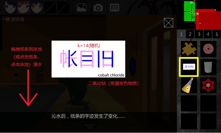 14.回到1F•游泳池,把【纸条】浸水(拖到泳池上),会显示K=?(随机,K∈[1,19])