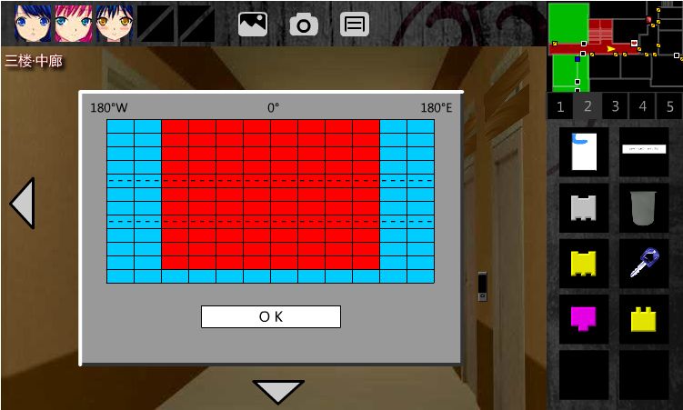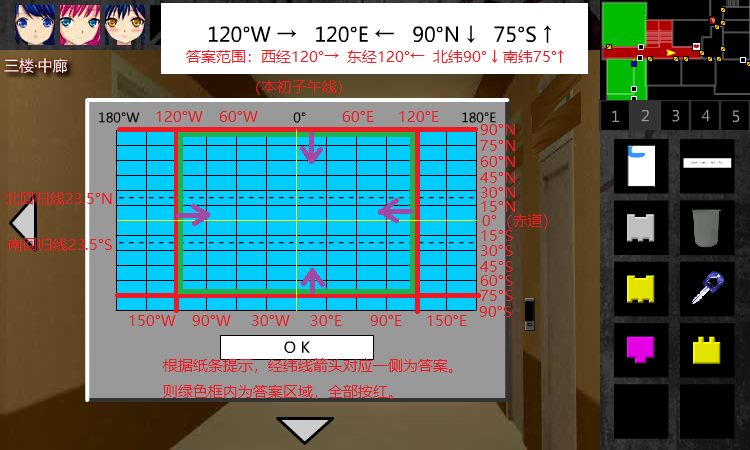 43. 回到3F•中廊,点击右侧密码器,解经纬网。珍弓给你提示。