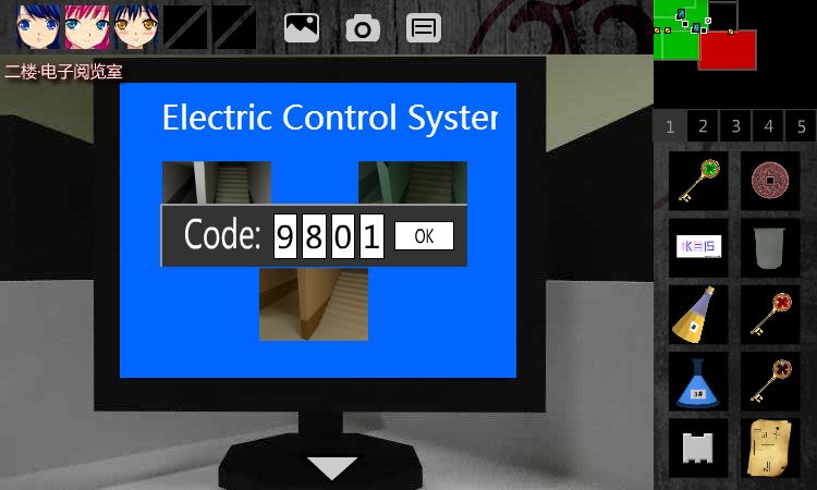 AD59.回到2F•电子阅览室,把左侧的电网控制系统(1F•更衣室走廊),输入9801(=99x99)解除。