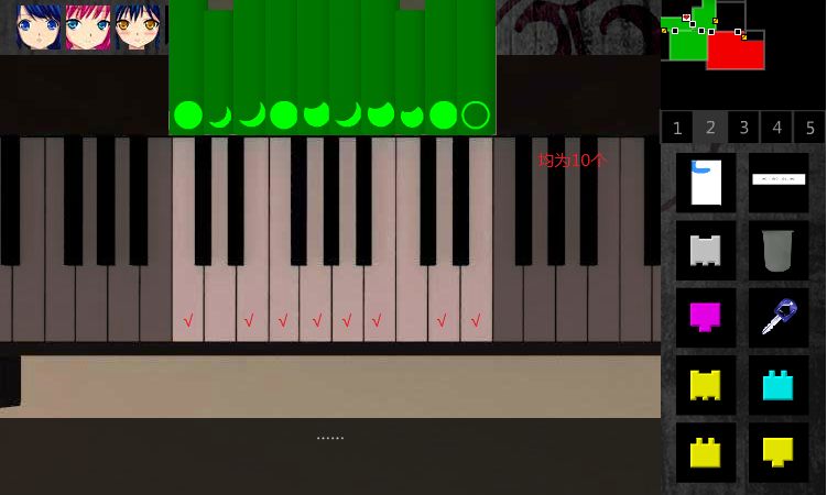 53. 回到3F•音乐室。右转,点击钢琴,一共可以按10个白琴键。10个联想到书本的个数也是10个,注意到绿色书的高矮程度,按下对应书本高的琴键,右边的门门锁解除。