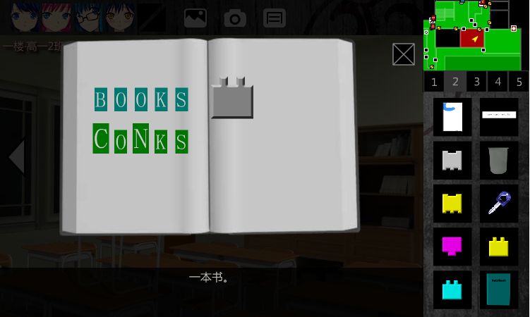 1F•高一(2)班课室有一本蓝色【书本】,取走,打开它,取走【灰色方块】。同时有线索。