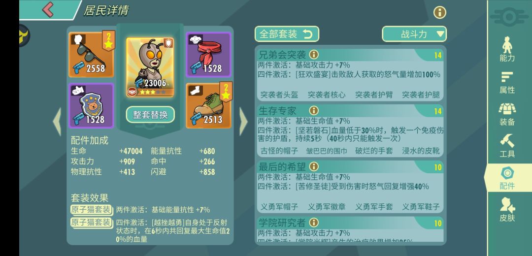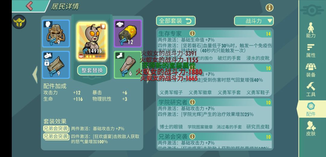 他们觉得能提高前排生存能力,事实上生存者的被动把火蚁女硬生生玩废了。火蚁女强就强在能反伤,可以对敌方后排造成高额伤害,以便我方输出收割。而穿上生存者套装的火蚁女不反伤,完全没用了。还有人给火蚁女穿义勇军,的确,义勇军是个万金油,谁都可以,但是却不是上策。大家公认的最适合火蚁女的配件就是原子猫了,