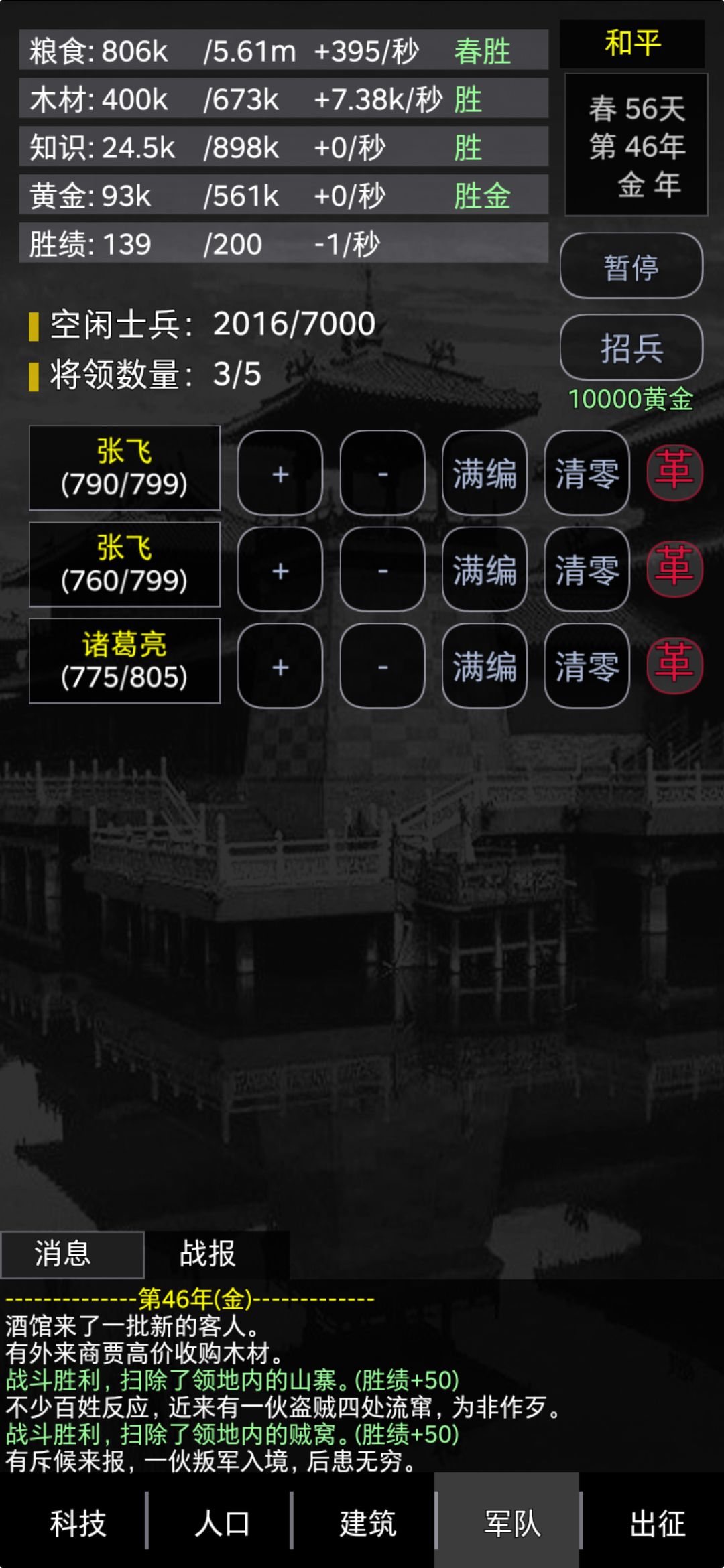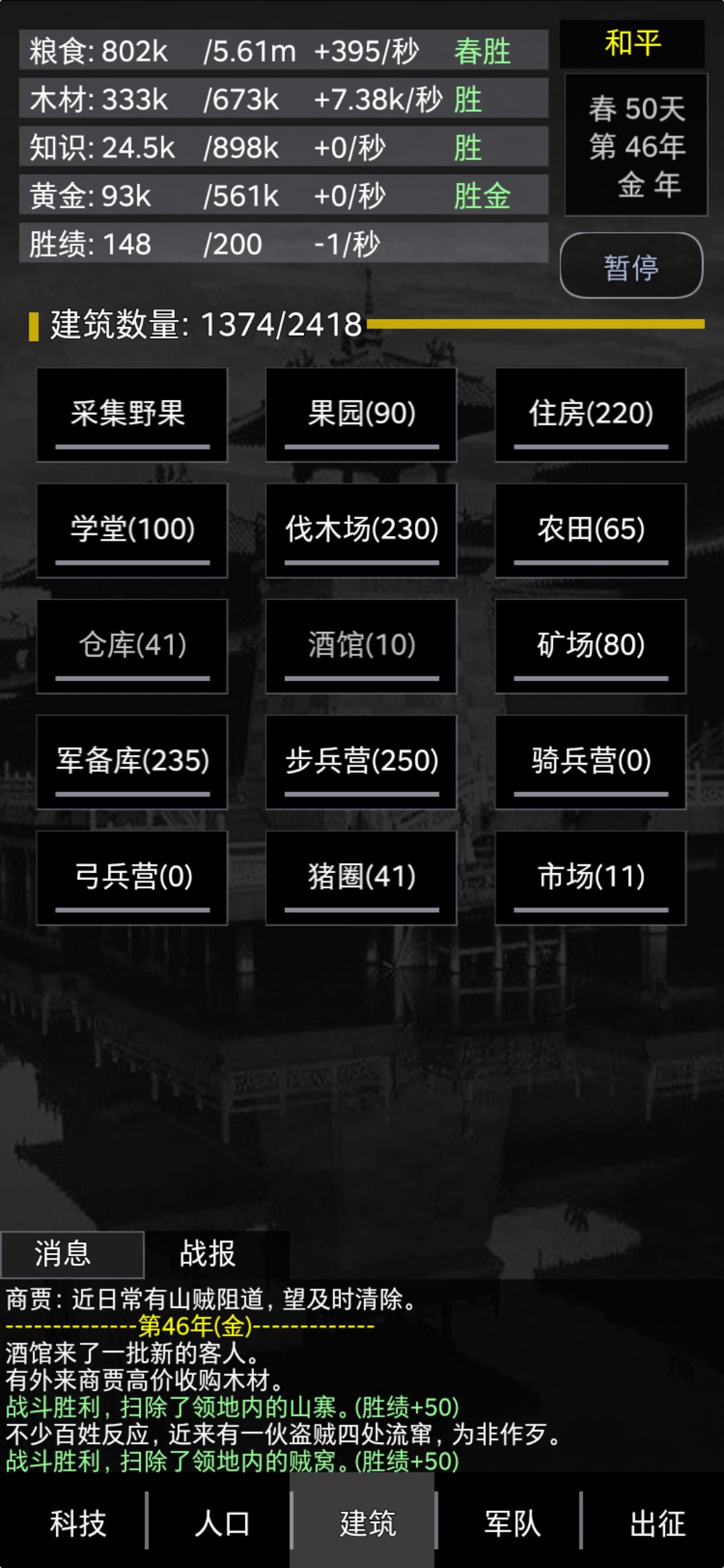 我这是二轮回带橙的局,即开局拿蓝武将自杀,第一轮回拿蓝武将开局打到酒馆6开橙武将自杀,第二轮回拿橙武将打通关,不得不说轮回橙卡直接15年没压力,所以前15年专心升伐木和人口,升到双100级不是问题,后面这俩门建筑始终要保持领先其他科技30以上,另外一个注意点是专注一个兵营比三兵营齐下更容易发育,多路发育更容易都发育不起来,对战死伤严重,导致不得不浪费时间掘金买兵,这是很影响前期紧张的发育节奏的,主升人口和伐木,副升军备库和选定的兵营库,推荐骑兵,这后期橙卡比较多选择,科技前期点到双人出站就可以了,等对面出三人再点上来即可,因为这样我们前期就有更多时间发育主点的建筑,木材效率高,自然一切都快了。然后再说一些注意点,猪圈和市场可以不点,酒馆6级出橙,不过我们是转生拿的橙所以不急着点,只要你兵营和军备点高,白卡都能秒对面蓝卡,果园50级就好可以不管了,有多可以留着免得你不留神饥荒走人,矿场也是不太需要点,我这是大后期有资源随便升的,买兵只要9年19年买满即可,可以用很久,后面等金年且没兵再买即可。就这些了。