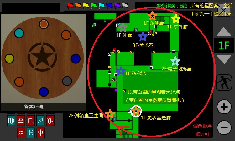 注意有一个是外边有白圈的(位置随机),以带白圈的为起点,从顺时针调颜色,进入2F•平台。顺序是: