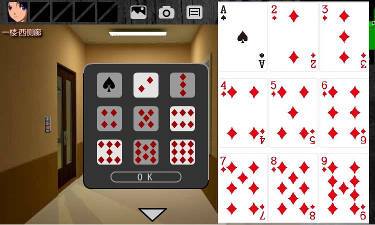 39.点击左侧门的扑克牌密码锁,你会发现首亮的是黑桃A(方片9),