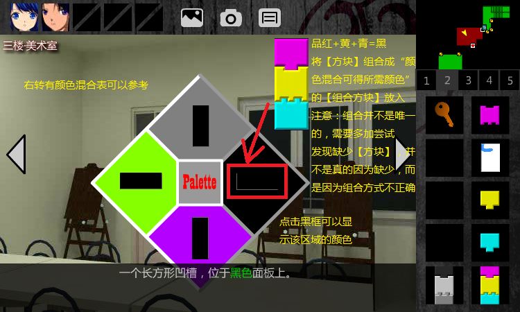 右转,将右侧调色板机关的【组合方块】回收,分解,至此就会有12个【方块】了。 如果没有,请回到1F•外廊(黑上),3F•语音室(品红上)和1F•游泳池(白中)重新寻找。