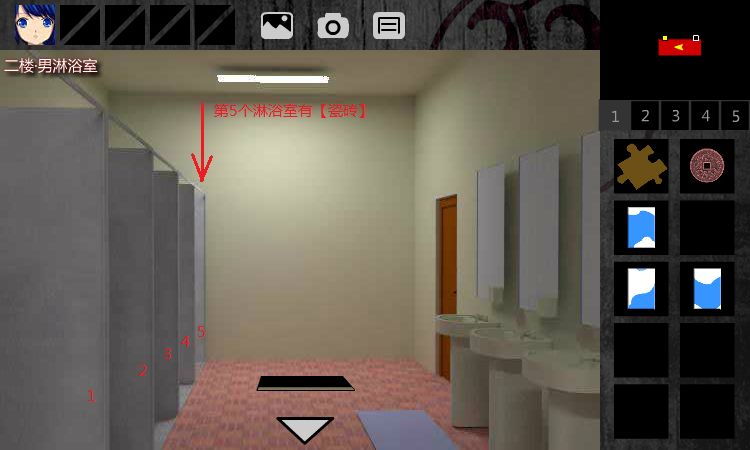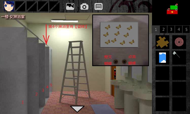 7.回到1F•女淋浴室,点击浴室,有蝴蝶图。在第4个浴室获得【瓷砖】。