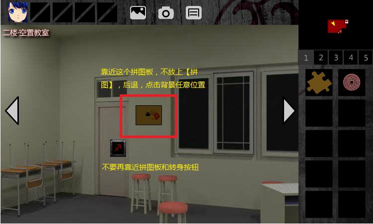 3.后退,点击图示位置的残缺拼图,不准备放上【拼图】,后退,点击背景任意位置(不靠近残缺拼图板,不转身,只点击这个背景)(进入隐秘的E线方法),触发剧情。