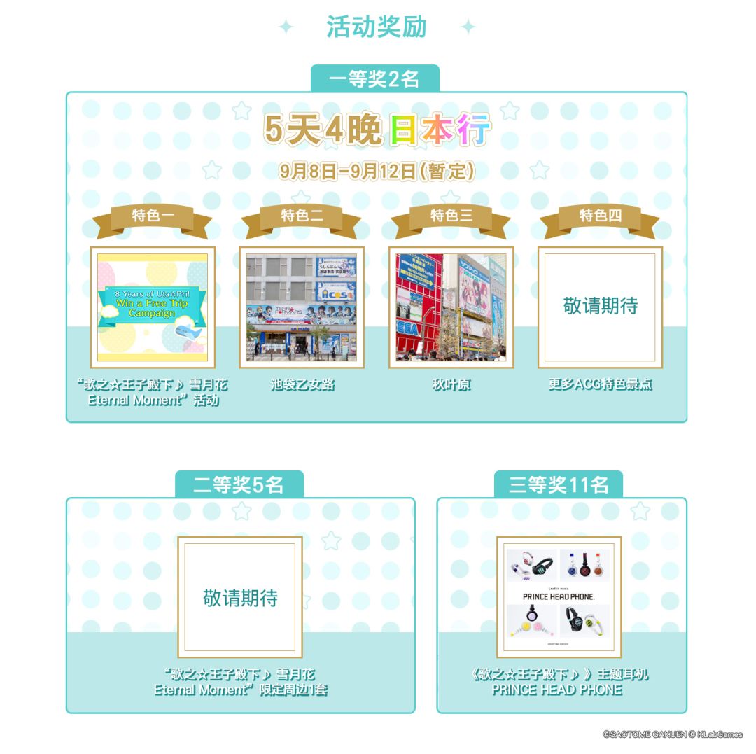 一等奖2名:5天4晚日本行——在官方工作人员的陪同下,前往日本参与“歌之☆王子殿下♪ 雪月花 Eternal Moment”活动;同时,还有机会游览体验池袋乙女路、秋叶原等日本代表性的ACG特色景点活动。