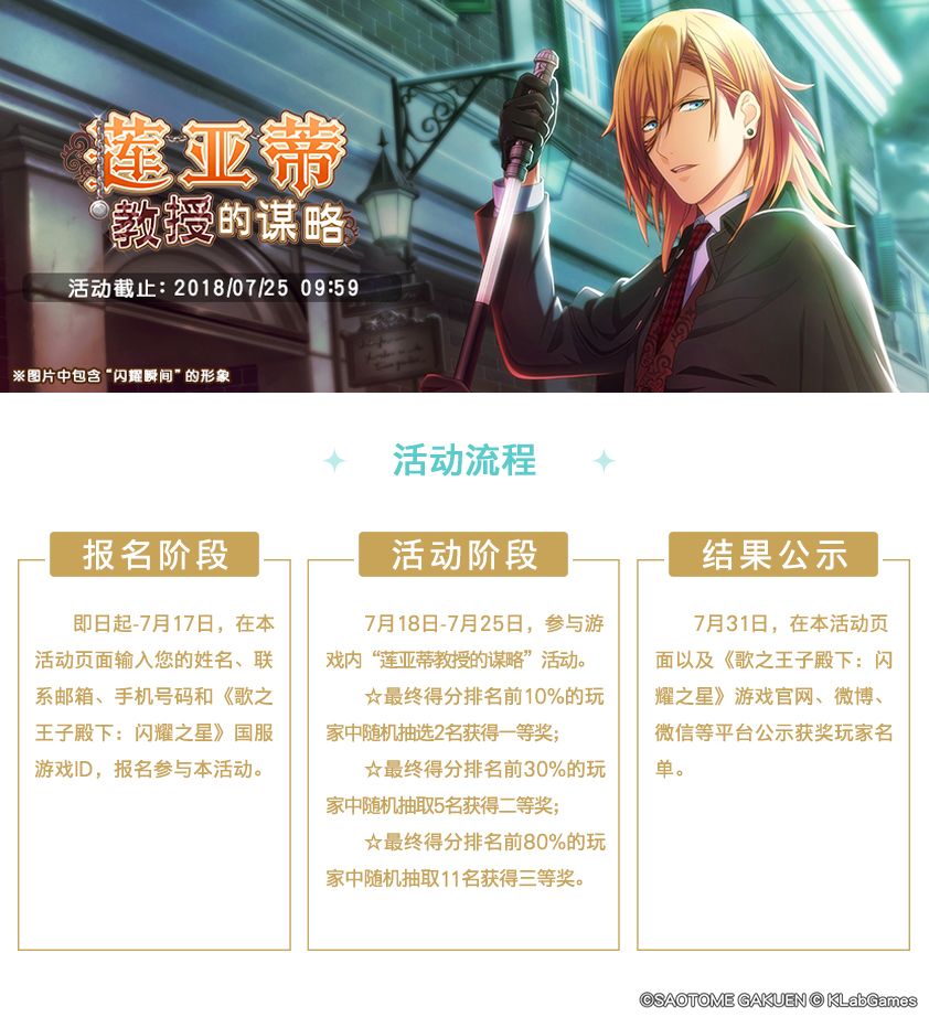 (3)结果公示:7月31日,在本活动页面以及《歌之王子殿下:闪耀之星》游戏官网、微博、微信等平台公示获奖玩家名单。