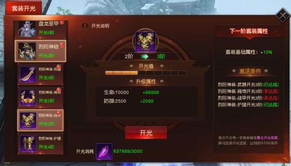 每个战灵部件也都是可以升级的哟,可以进行开光升阶。开光可有意思了,每次的开光都有可能触发暴击,跳过当前的开光步骤,让部件立刻升阶,比拼欧气的时刻到了!装备强化都不敢这么玩呢~而当每一个部件都升阶后,套装效果也会升阶,提供的属性加成也就更高辽。果然每个战灵都是偶像派和实力派的融合~