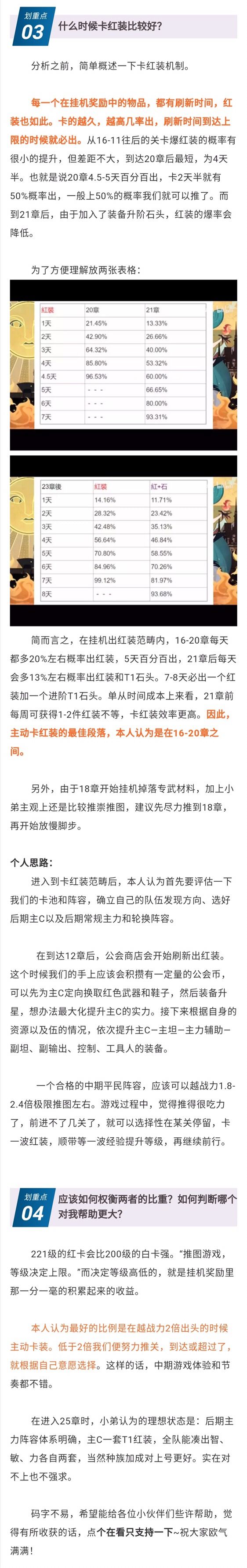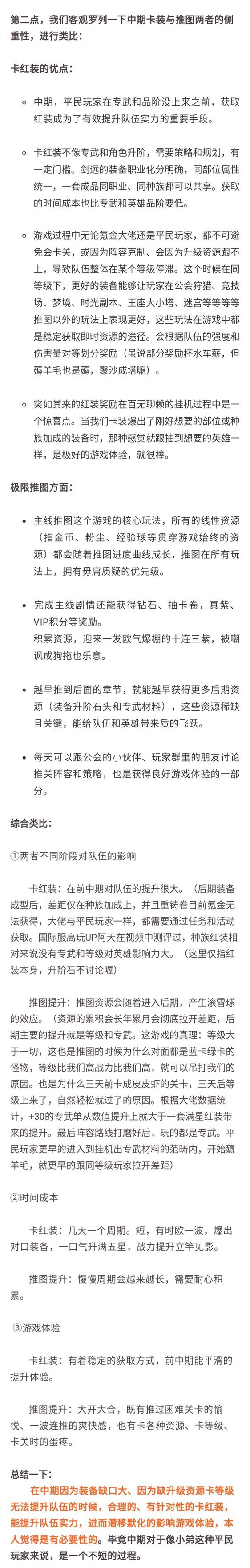 前段时间写了一篇装备优化升级的小贴示,收到很多小伙伴的回复,其中很多问到卡红装和推图的取舍问题。因此查阅了一下视频和攻略,加上自己的一点点看法,整理分享出来。(在此感谢公众号的小伙伴帮忙排版)