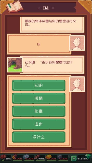 知识=探索,激情=战斗,财富=采集,进步=建造