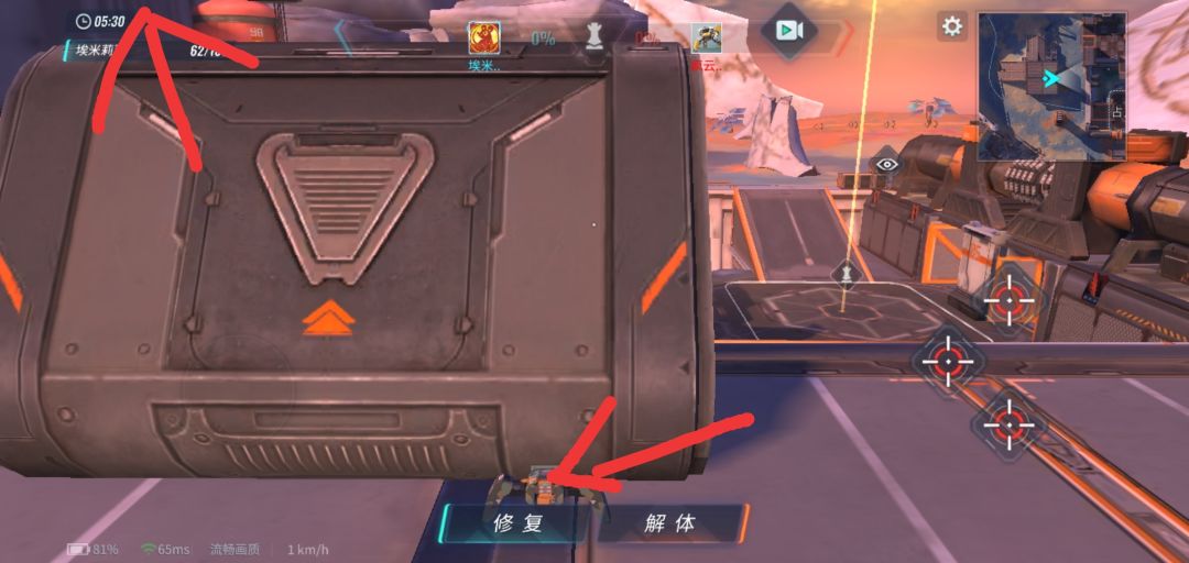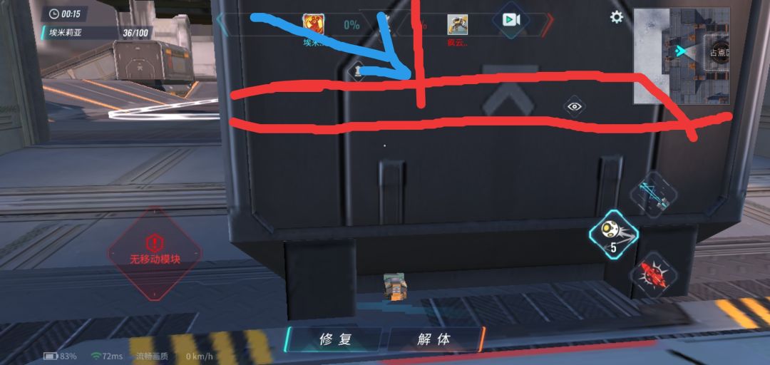 这里首先如果你在他没进去之前能尽量防住就直接打死,这种车的核心在最后面,很明显。——没防住让他进去了的话,你们尽量把战场拖到对面那个他狙不到的占点区(蓝色箭头)