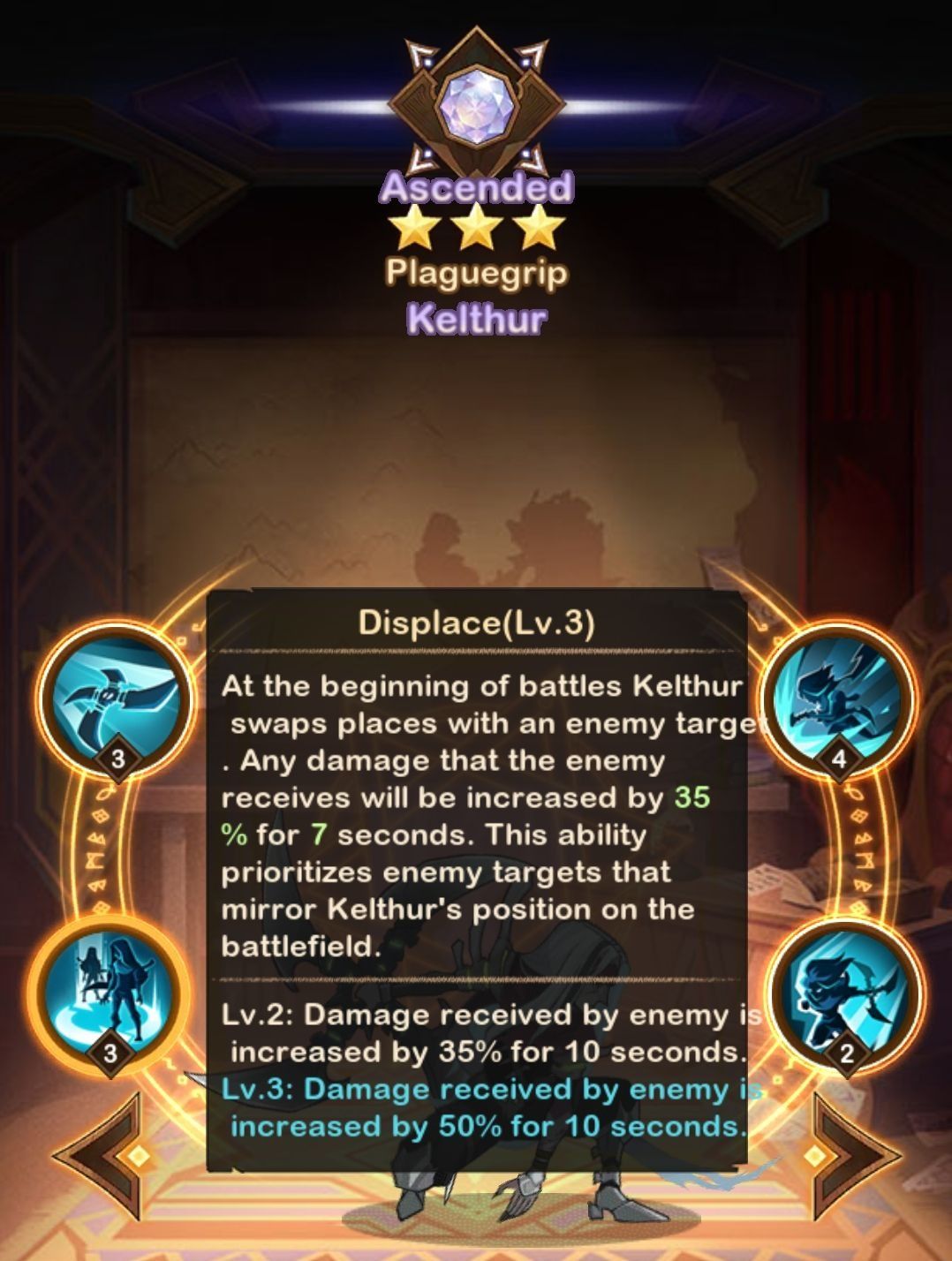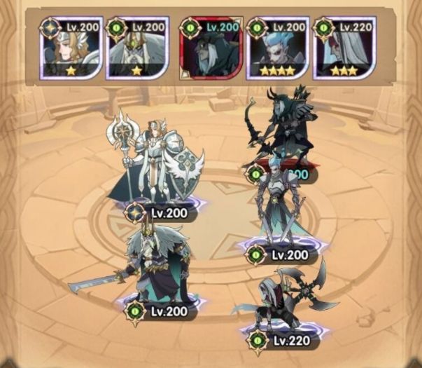 从图上我们可以看出,这阵容的核心在于220级的甘瑟尔,获胜思路则是利用甘瑟尔和我方后排换位,凭借法瑞奥和格瑞泽尔勒的物理输出击杀后排,打乱常规阵型,同时利用亡灵军团的羁绊,给予阵容一定的生命和攻击百分比加成,从而获得胜利。