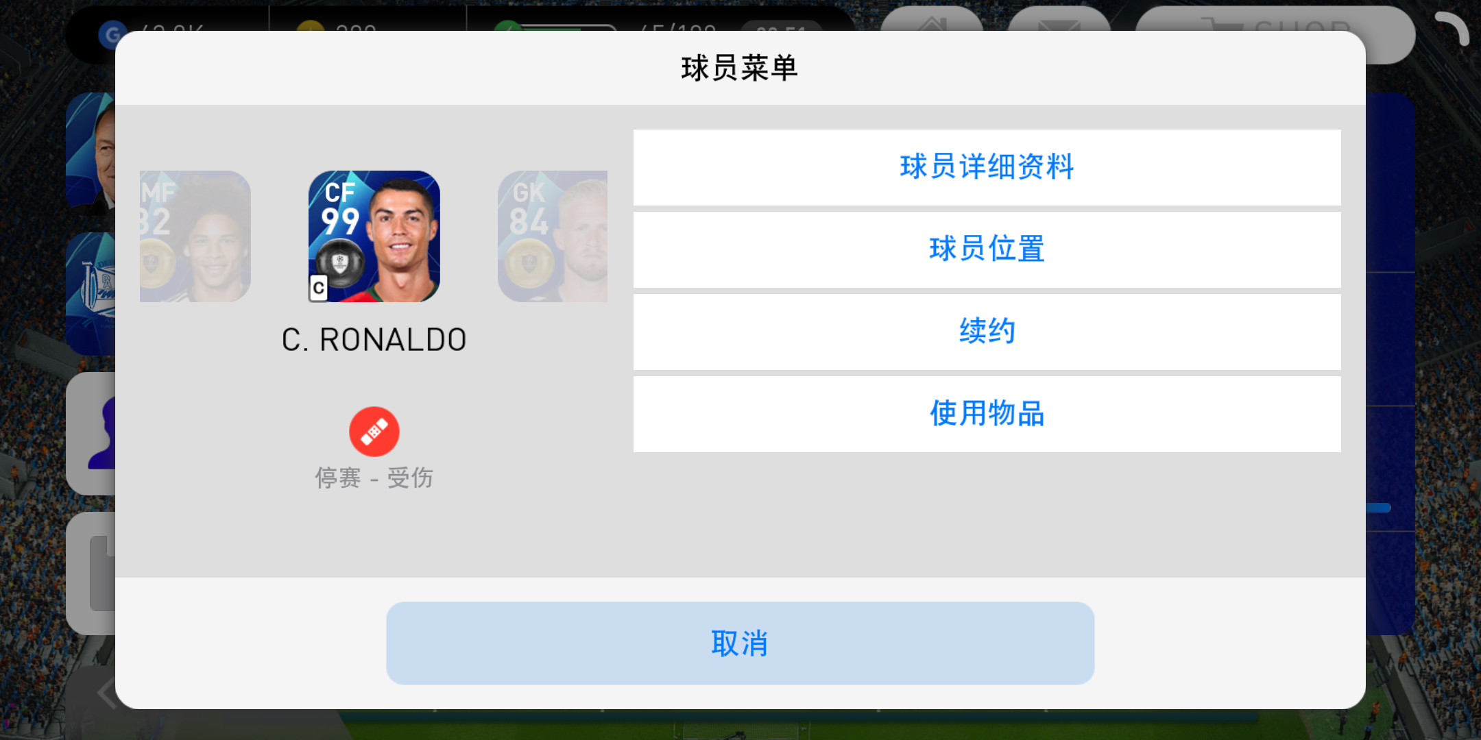 今天玩外服,用的5221,C罗单箭头,结果打了几场都被对面后卫疯铲,不过就算受伤也会马上回来。最近一场上半场C罗就受伤被自动换下。比赛结束后,发现还要停赛一场,需要这么真实么。。