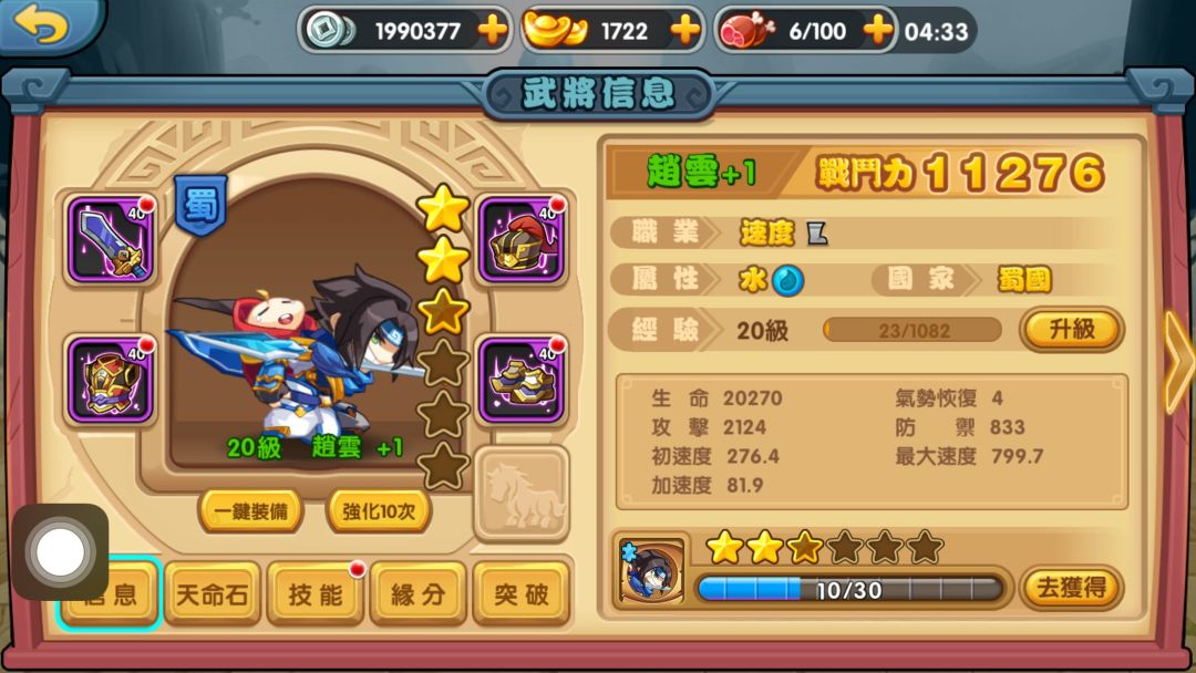 首先,要瞭解戰力系統可以通過什麼來提升,先說縱向養成,單個武將由武將等級、天命石升階、技能提升,緣分加成、突破後加屬性、升星增加屬性、