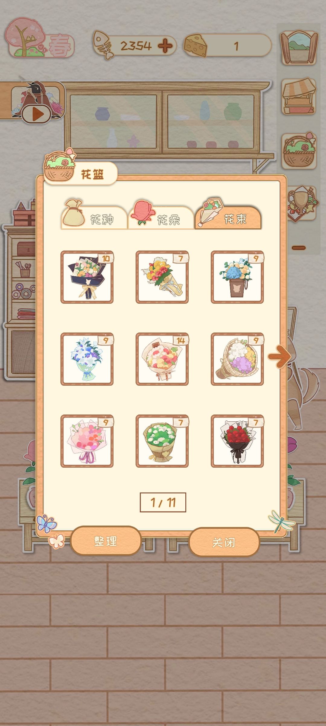 现在已经做成了9种花束,如图。 另外发现其中7种花束都需要白色的花哦,所以要合成花束最好多屯点白色的花噢 。