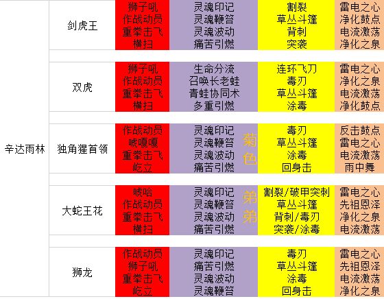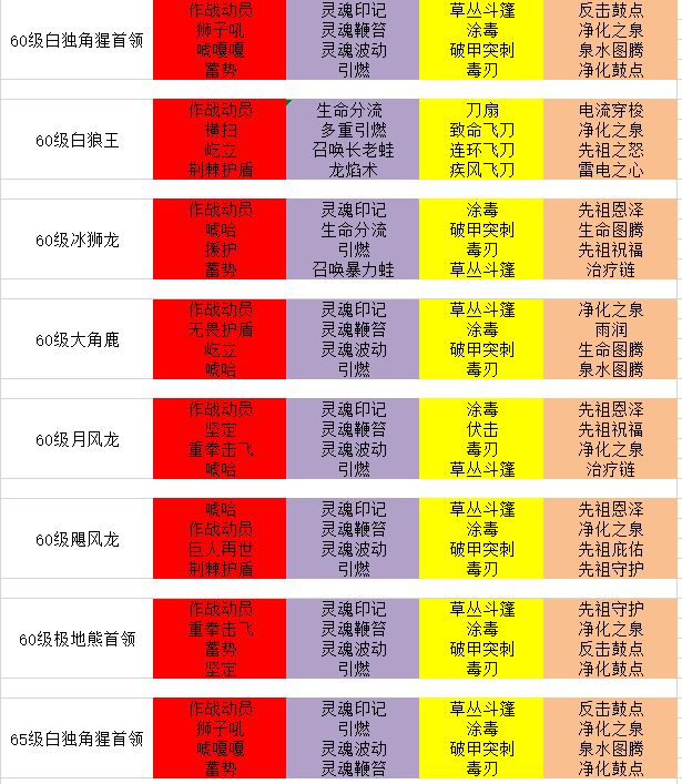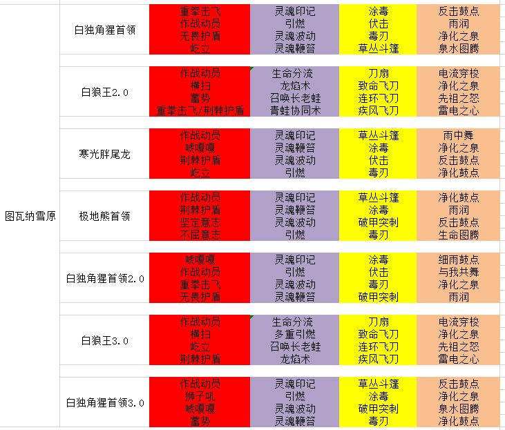 白牦牛王、苍虎王、狮龙、猛犸、冰冠龙、小刀疤兔、剑虎、雪地嘟嘟鸟、座狼王