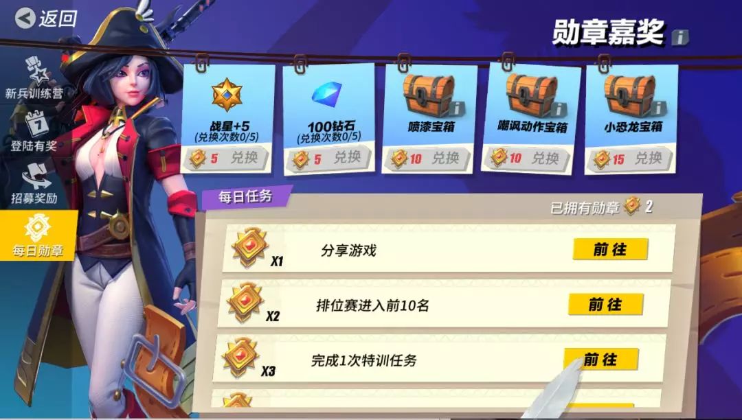 (2)勋章嘉奖活动:勋章嘉奖活动永久开启!完成每日任务可获得勋章,使用勋章可兑换常规奖励—战星、钻石;常规奖励有兑换上限,每周一0:00重置兑换次数。还可兑换宝箱奖励—喷漆宝箱、嘲讽动作宝箱及小恐龙宝箱,宝箱奖励无兑换上限。开启有机会获得喷漆、嘲讽动作、永久小恐龙皮肤、英雄皮肤体验券、武器皮肤体验券等丰厚奖励。