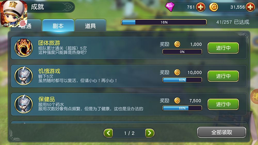 游戏中有三类成就:普通、副本、道具。普通成就覆盖游戏的方方面面:等级、战力、好友数量、公会等等;副本成就包括副本行为:通关某阶段性副本、喝药次数、愤怒次数、躺下次数等等;道具成就即对道具操作的成就:分解装备、升级装备、进化装备等等。成就达成就有金币钻石等各种奖励,并且奖励十分丰厚哦。