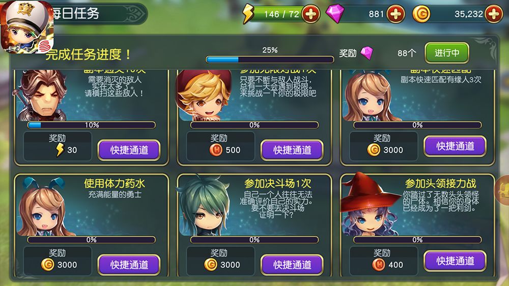 每日任务中也有部分任务会奖励金币,如完成副本快速匹配三次即可获得奖励3000金币。每天都来参与一遍,积少成多,也会是一笔稳定的收入呢。