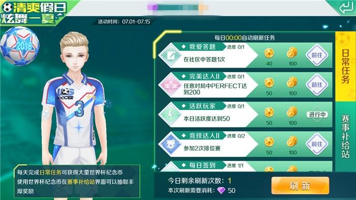 玩家在7月1日至7月15日之间登录QQ炫舞手游,可以参加狂欢世界杯的活动。在活动期间,每天完成狂欢世界杯的任务就有机会获得丰厚奖励。活动任务非常简单,比如登录游戏、在社区中答题一次、挖宝一次、幸运邮轮许愿一次、参加两次排位赛、在对局中获得Perfect达到200次等,这些活动任务对于大家来说自然是小菜一碟啦!