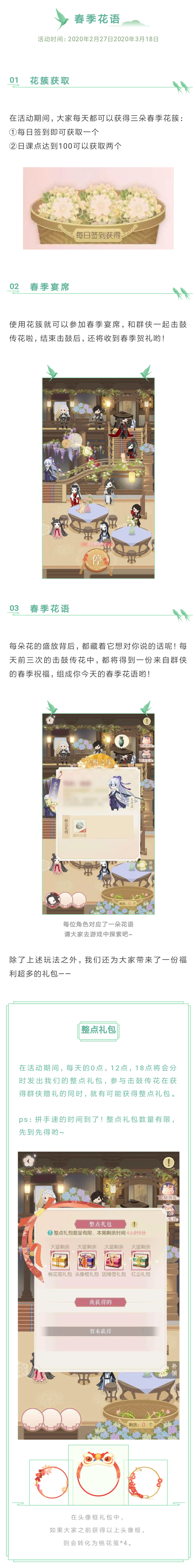 本周四(2月27日)更新后,遇见逆水寒的小伙伴们在春季盛宴里,带着丰厚的礼物等大家哟~