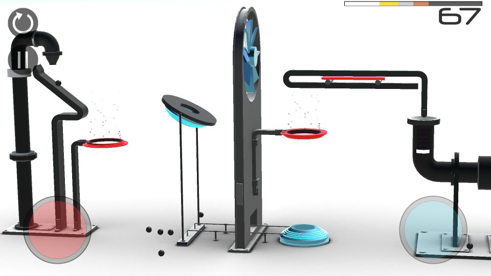 键位设置如图,小球划落后按住红键让小球加速,然后立即放开(不然会因为时间问题而无法再次加速),之后按下蓝键(不能按太久,不然小球会被吹走,只要传送过去就放开),小球传送过去后立即放开蓝键按下红键,然后小球会落在红色移动板上,然后轻按蓝键把小球吹进导管中,完成