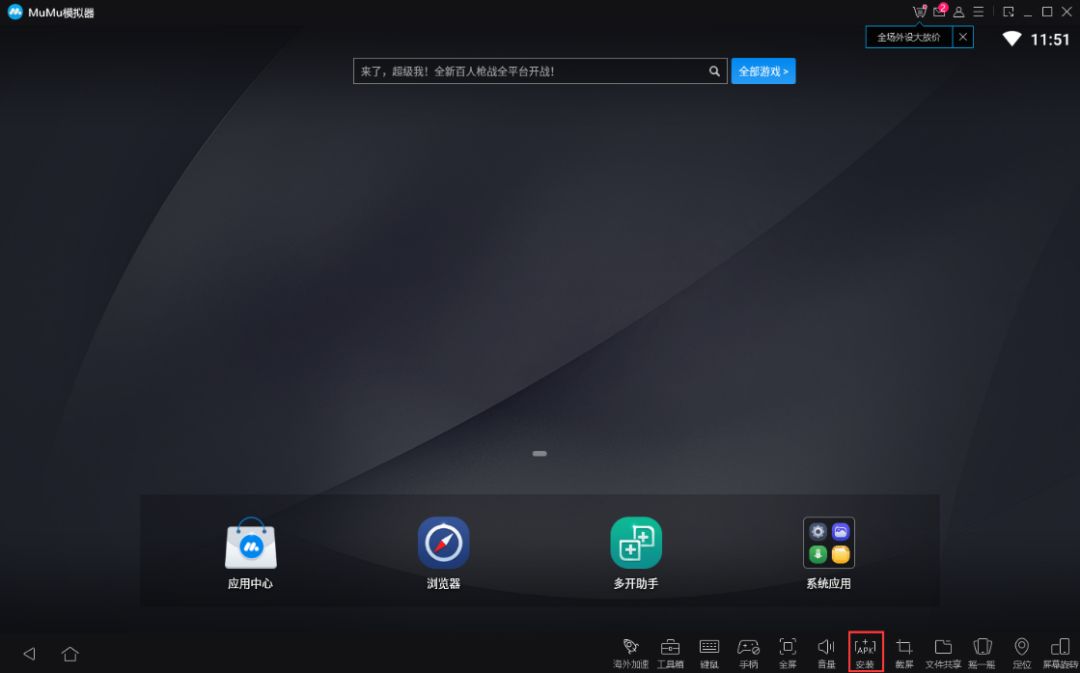 1、首先请大家打开下载的最新版本“MUMU模拟器”,点击右下角的“APK安装”一项,找到下载的安装包后即可安装游戏。