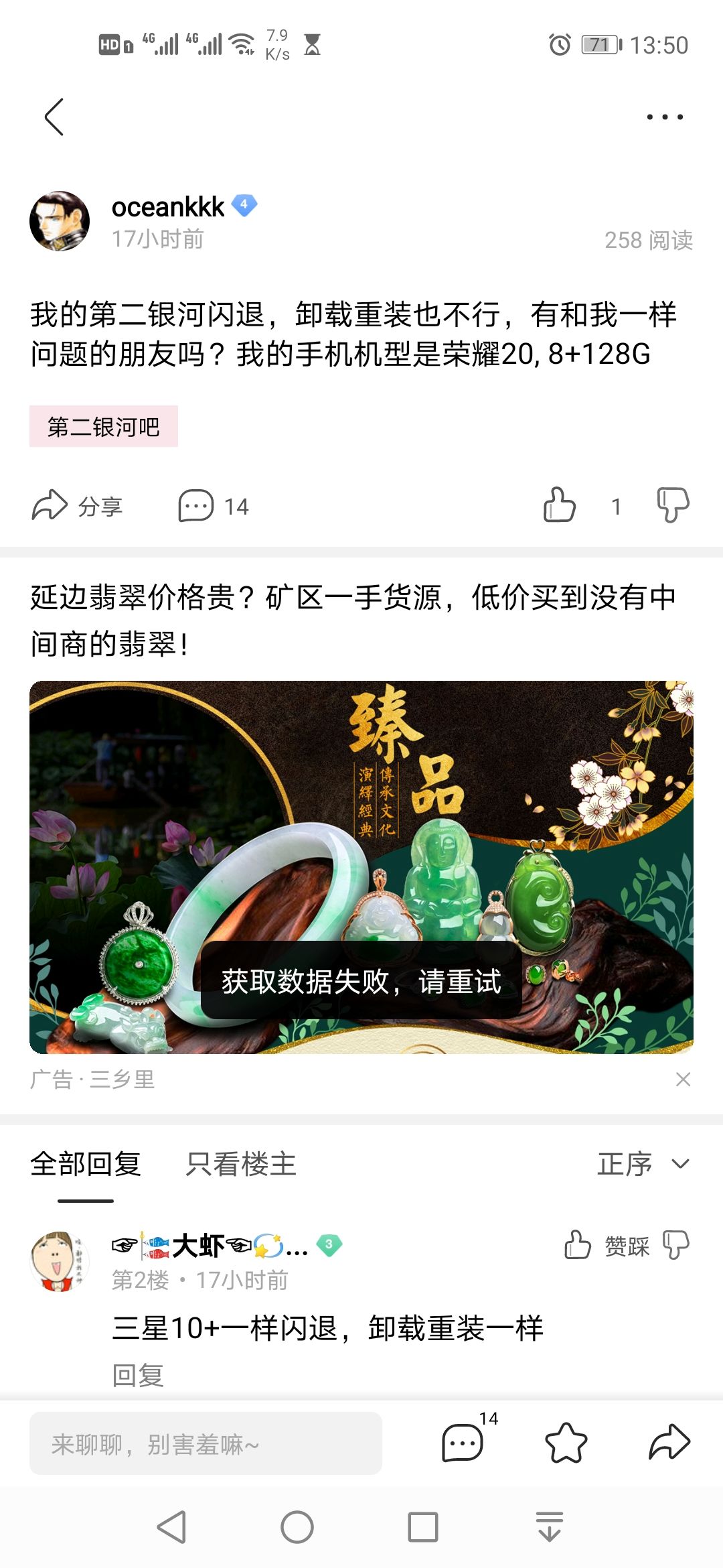 我的第二银河闪退,卸载重装也不行,有和我一样问题的朋友吗?我的手机机型是荣耀20, 8+128G