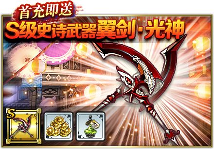 活动详情:玩家首次充值后,即可领取S级史诗武器-翼剑・光神等丰厚奖励。