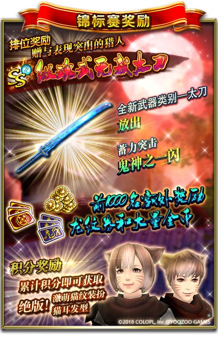 活动详情:活动期间,击杀大型怪物获得积分,成为大陆的最强猎人。猎人勋章商城可兑换超强SS武器——无我太刀