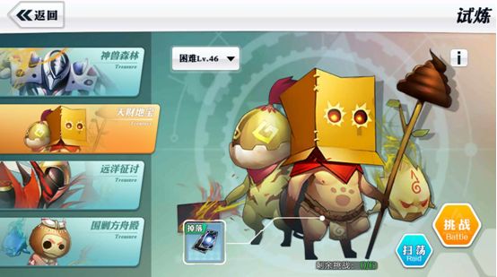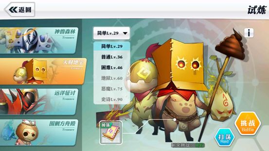 “天财地宝”是《超燃斗魂》试炼玩法中的一个玩法,在玩家等级达到29级时就可以参与简单难度,伴着玩家的实力上升,也可以调整更高难度的天财地宝,难度越高奖励越丰厚!