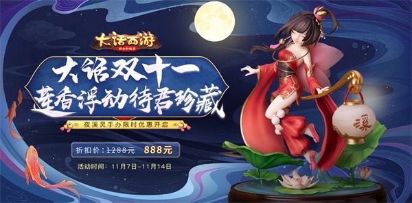 足踏莲波款款至,灯映倩影照芙蓉。温柔俏丽的玲珑鬼仙,手执花灯轻踏莲池,这款夜溪灵手办作为大话手游最经典的周边之一,在此次大话双十一活动中也以超值折扣限时上架!原价1288元的夜溪灵手办,在11月7日-11月14日活动期间仅售888元,超值优惠价不容错过,等你将她带回家细细珍藏!