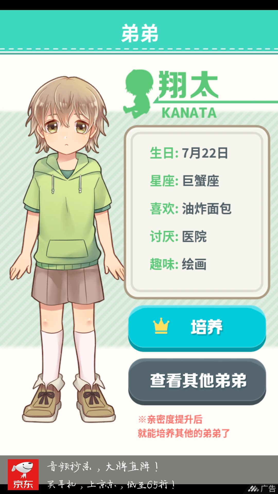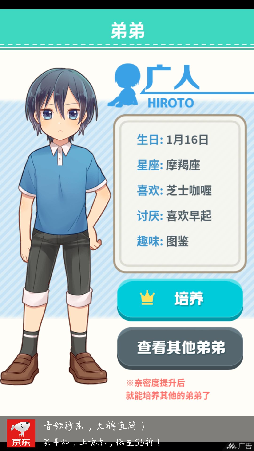 今天是第一天玩,设定选了姐姐,培养的弟弟选了广人(一开始只能选一个,亲密度提升了之后才能选别的弟弟),第一印象广人就给我比较成熟稳重的感觉,对陌生人比较警惕,相处下来发现他并不傲娇只是不太会表达自己的情感,会比较害羞但也会稍稍透露一下自己的感情。