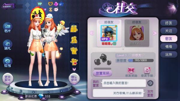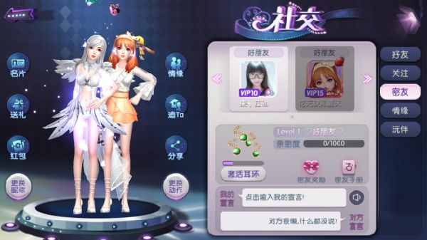 如果在游戏中遇见了心动的TA,玩家通过和TA结为密友的方式,就可以进行更近一步的接触。成为密友后,无论是选择录制声音还是输入文字,都可以灵活地记录专属二人的密友宣言,向大家宣告和TA的亲密关系。